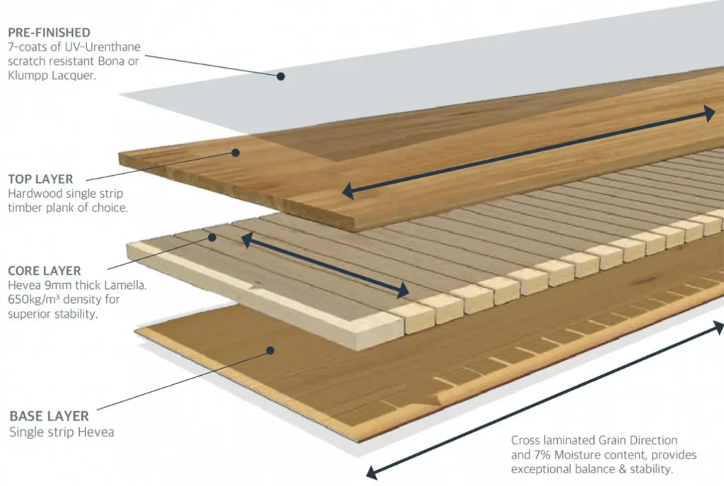 This layered construction allows engineered timber to handle humidity better than solid wood, which is why it’s commonly used in Singapore.